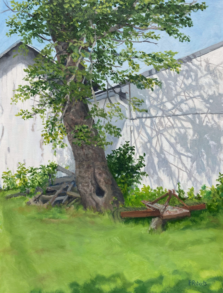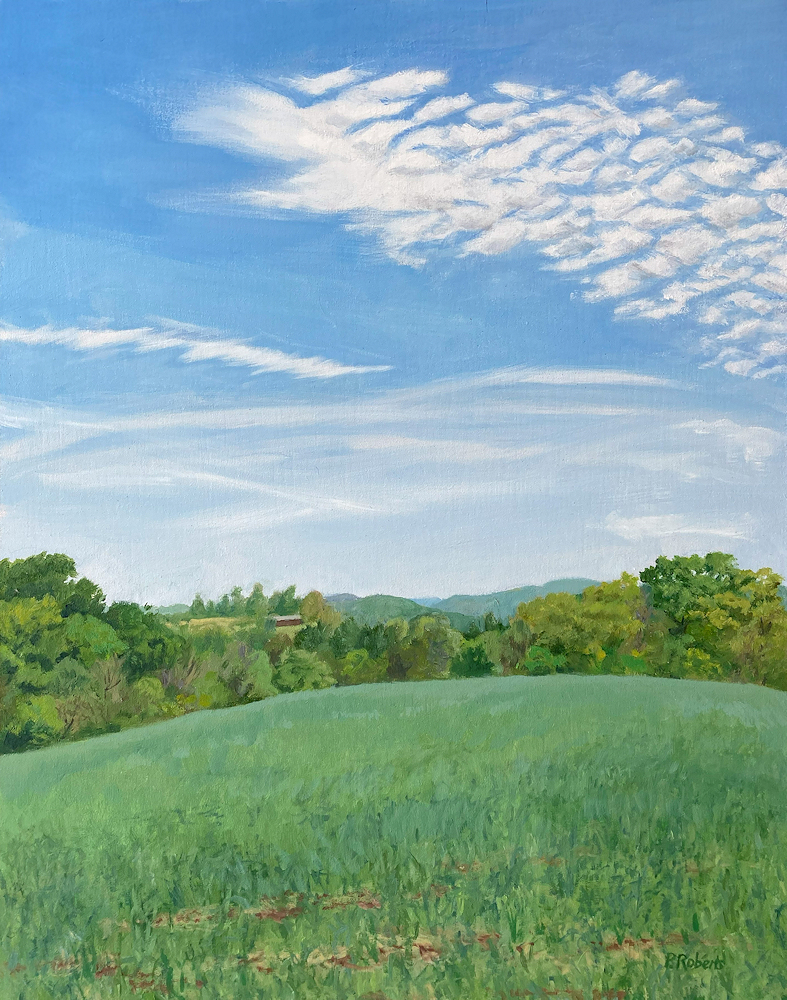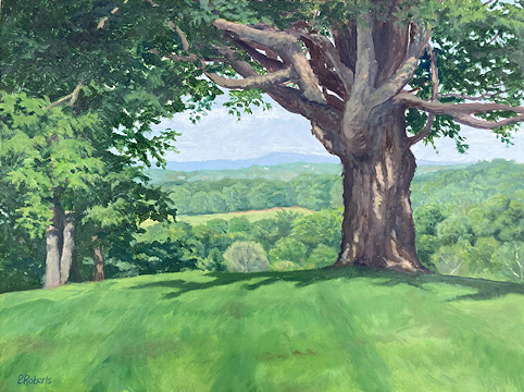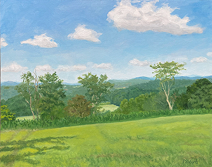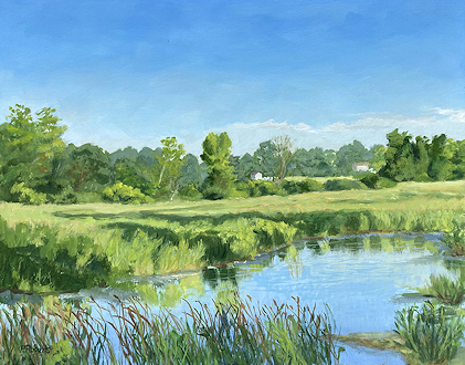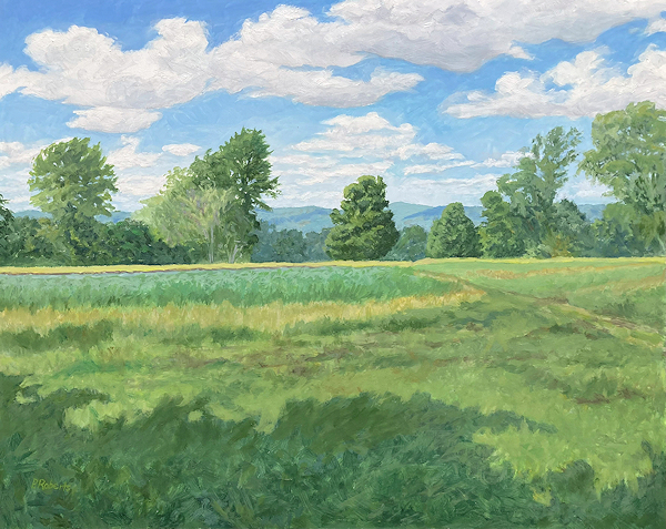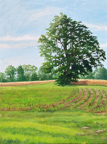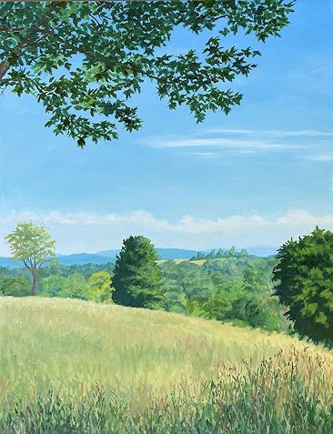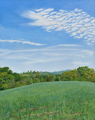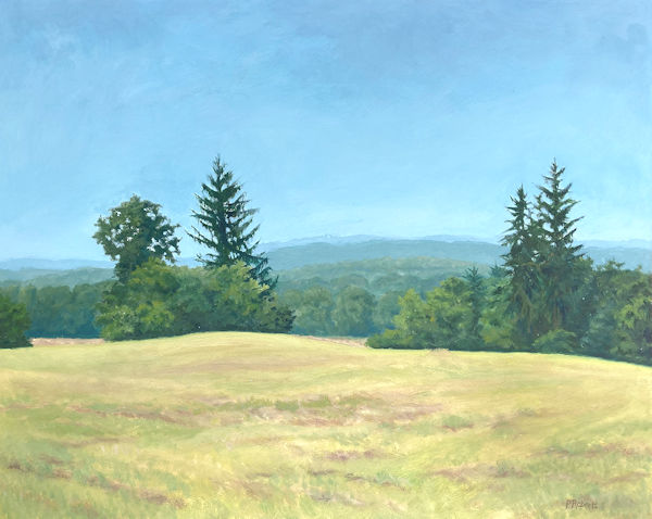 Painting with oils on either panel or Arches cotton paper, I work on-site (en plein air), trying to convey the quality of light and space. This is both fun and frustrating, since the light constantly changes and shifts, not only by the minute, but from day to day, with temperature and humidity. And when the light shifts, the way you see space and distance changes, so it's a race to capture the essence of the scene.I love sitting in a field hearing the bugs and birds going about their business. And I'm lucky enough to live in a place where there's open land that probably hasn't changed much in generations.